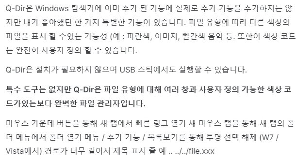 6. Q-Dir의 추가 기능으로는 파일 유형별로 색상을 설정할 수 있는 기능이 있습니다. 예를 들어, 이미지 파일은 파란색, 음악 파일은 빨간색 등으로 설정하여 파일 종류를 쉽게 구별할 수 있습니다.