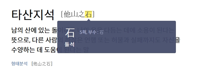 2. 검색창에 타산지석을 입력하면 간단명료하게 뜻이 바로 보여요. 여기서 중요한 건 단순히 뜻만 읽지 말고, 그 속에 담긴 깊은 의미를 생각해보는 거예요. 남의 실수도 내 성장의 밑거름이 된다는 이 말, 평소 생활 속에서 어떻게 적용할 수 있을지 한번 고민해보면 좋겠죠?