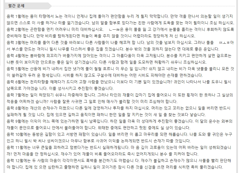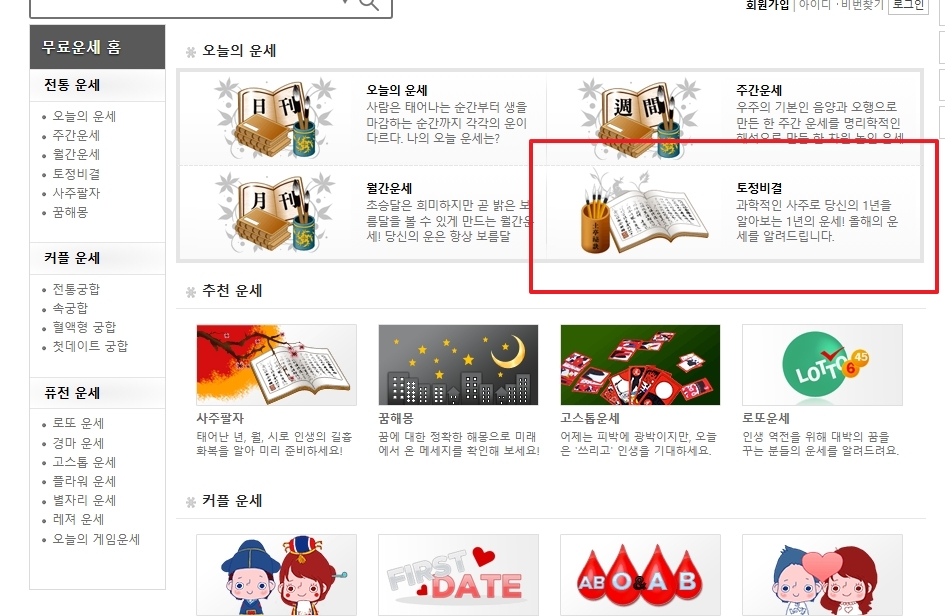 3. 무료운세 항목에 들어가면 다양한 운세 메뉴가 나옵니다. 이 중에서 토정비결을 선택하면, 한 해의 흐름을 미리 살펴볼 수 있는 자세한 운세 풀이를 확인할 수 있어요. 이 서비스는 비교적 깊이 있는 설명이 많아서 시간 가는 줄 모르고 읽게 됩니다.
