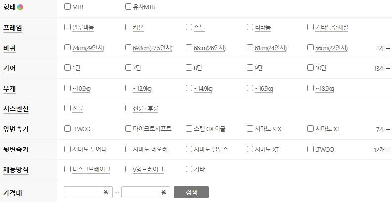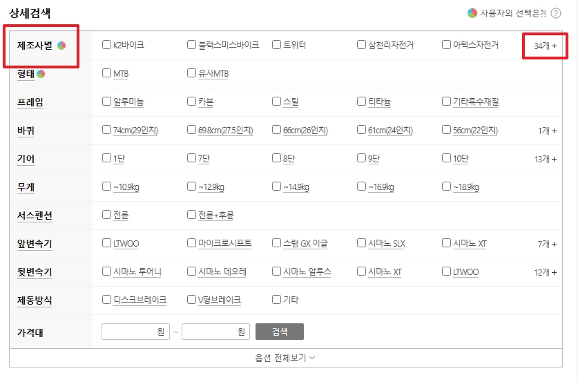 3. 조금 더 세밀하게 찾고 싶다면 상세 검색 옵션을 활용하세요. 여기서 제조사별로 필터링이 가능한데요, 트렉, 메리다, 스캇, 캐논데일 같은 유명 브랜드부터 국내 브랜드까지 쭉 나옵니다. ‘더보기’ 버튼을 눌러서 다양한 제조사를 한눈에 확인할 수 있어요.
