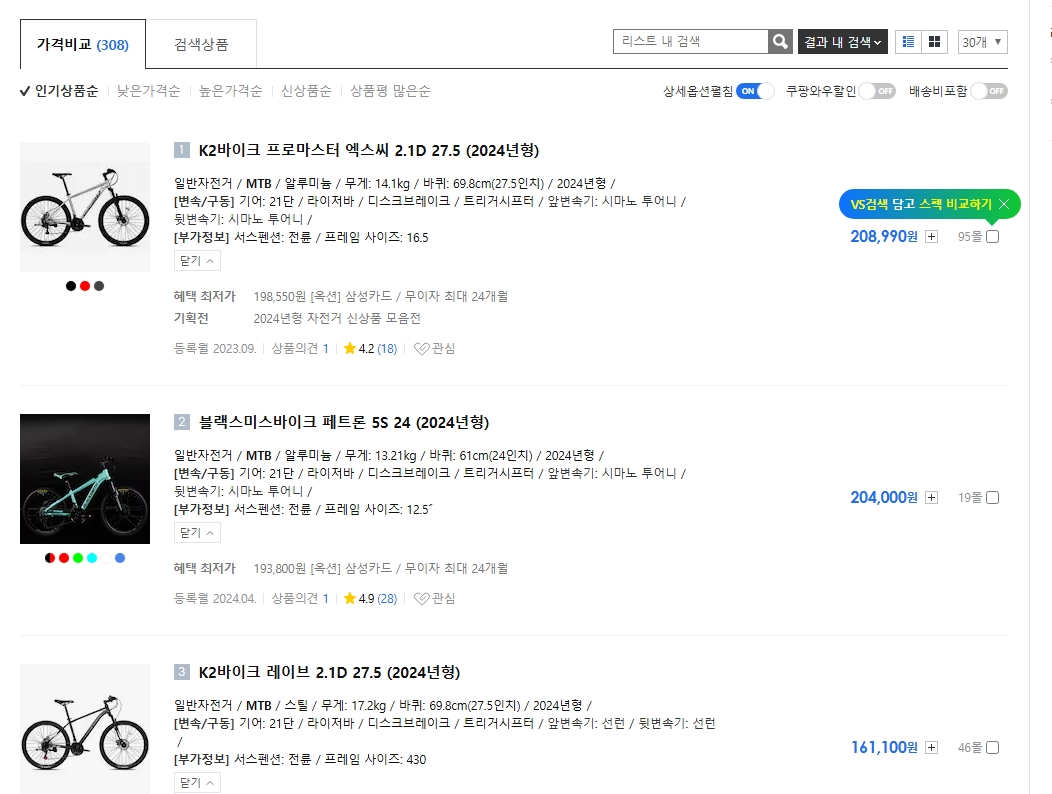 4. 인기순으로 정렬하면 요즘 어떤 자전거가 가장 핫한지 쉽게 알 수 있어요. 요즘은 입문자용 하드테일부터 전문가용 풀 서스펜션까지 인기 제품들이 빠르게 변동되니까, 인기순 리스트를 체크하는 것만으로도 트렌드를 읽을 수 있답니다.