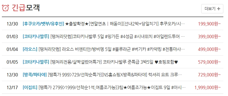4. 출발이 얼마 안 남은 상품을 모아놓은 긴급 모객 메뉴도 따로 있어요. 후쿠오카, 코타키나발루, 방콕 같은 곳을 특가로 예약할 수 있는데, 출발 날짜랑 가격이 바로 보여서 급하게 여행 가야 할 때 유용합니다. 일정이 유동적인 분들께 딱이에요.