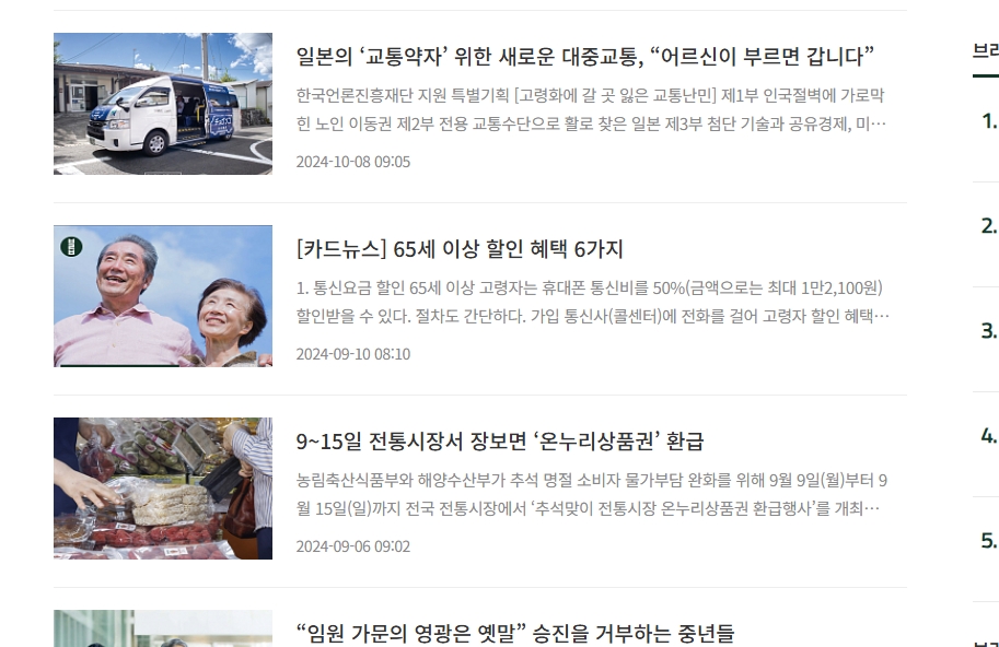 2. 검색창에 65세 이상이라고 입력한 뒤, 관련 기사 중 65세 이상 할인 혜택 6가지를 찾아 클릭합니다. 교통, 문화, 통신 등 일상에 바로 적용할 수 있는 정보들이 정리되어 있어요.