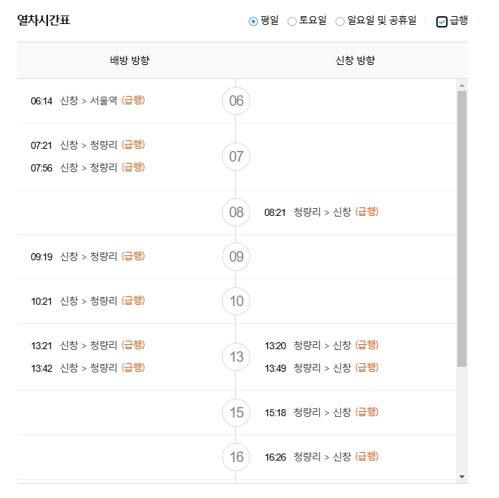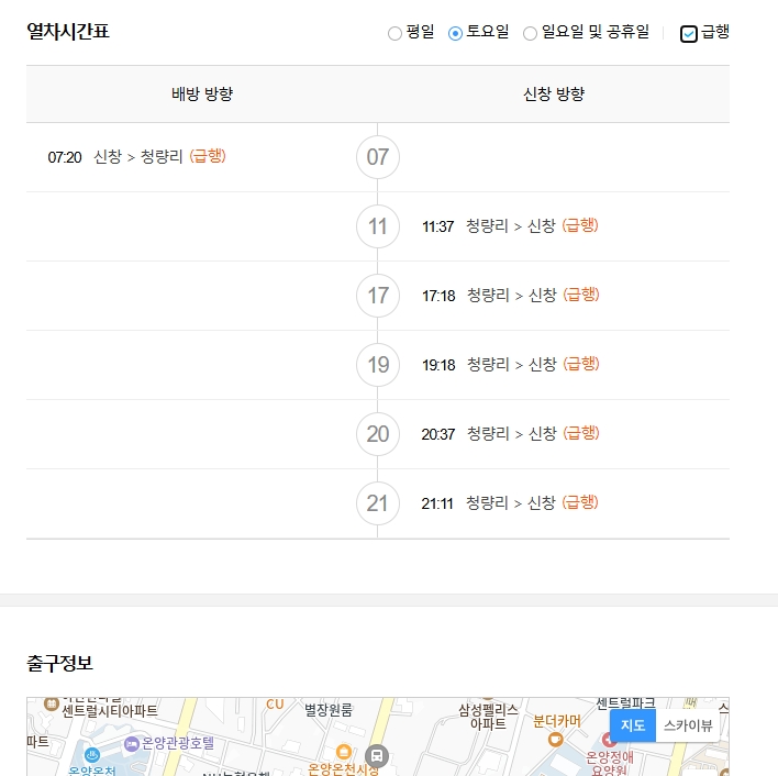 3. 토요일 시간표를 보면, 신창에서 청량리로 가는 급행열차가 아침 7시 20분에 출발합니다. 반대로 청량리에서 신창으로 가는 첫 열차는 오전 11시 37분에 출발하구요. 주말에 이용 계획이 있다면 이 시간대를 꼭 체크해두시는 게 좋아요.