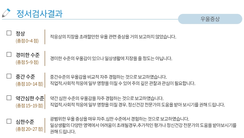 답변을 마치면 점수 합산 결과를 바로 확인할 수 있습니다. 낮은 점수는 가벼운 우울감을, 중간 이상 점수는 좀 더 세심한 주의가 필요한 상태를 의미하며 높은 점수는 전문 상담을 고려해 볼 만한 수준을 가리킵니다. 이 수치는 공식 진단 대신 간단한 참고 자료로 활용하시면 좋습니다.
