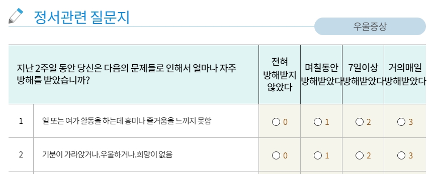 2. 홈페이지 메뉴에서 ‘자가진단’을 선택한 다음 ‘우울증상’ 항목을 눌러주세요. 그러면 최근 2주간의 기분이나 행동 변화에 대해 질문하는 테스트 페이지로 넘어가게 됩니다. 클릭 몇 번이면 쉽게 시작할 수 있어요.