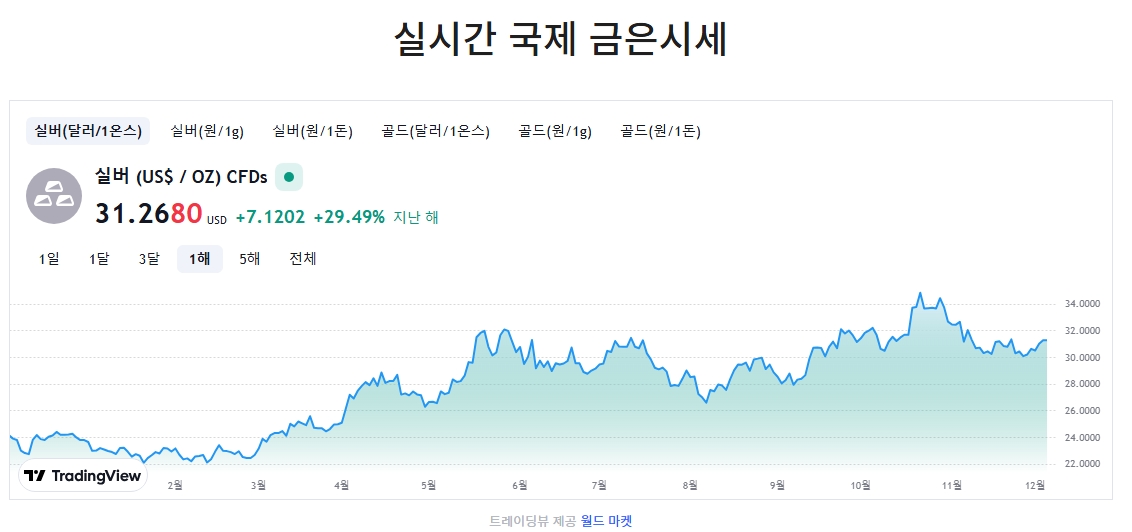 2. 사이트에 접속하면 바로 보이는 메인화면에서 실버의 국제 시세가 나타납니다. 현재는 1온스당 31.2680 달러로 표시되고 있고, 전년도와 비교해 약 29.49% 올랐다는 수치가 함께 보여집니다. 이 수치는 자동으로 계속 갱신됩니다.