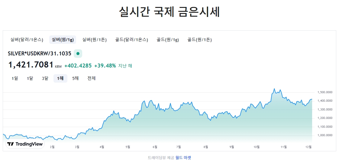 3. 실버(원/1g) 항목을 선택하면 1g 기준의 가격도 확인할 수 있습니다. 지금은 1,421.7081원으로, 작년보다 약 39.48% 정도 상승한 수치라고 나오네요. 하단 그래프를 보면 최근 1년간의 흐름이 한눈에 들어옵니다.