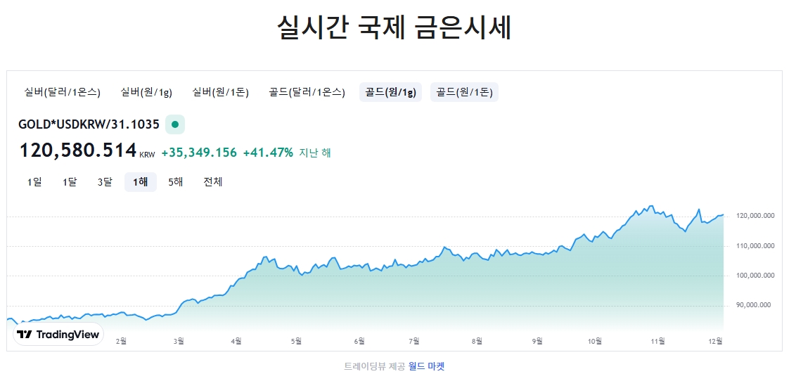 6. 금 1g당 원화 기준 시세도 제공되고 있습니다. 골드(원/1g)를 보면 120,580.514원으로 현재 표시되고 있고, 작년에 비해 약 41.47% 상승했다고 나오네요. 금 시세의 흐름도 직관적으로 보기 좋게 구성되어 있어요.