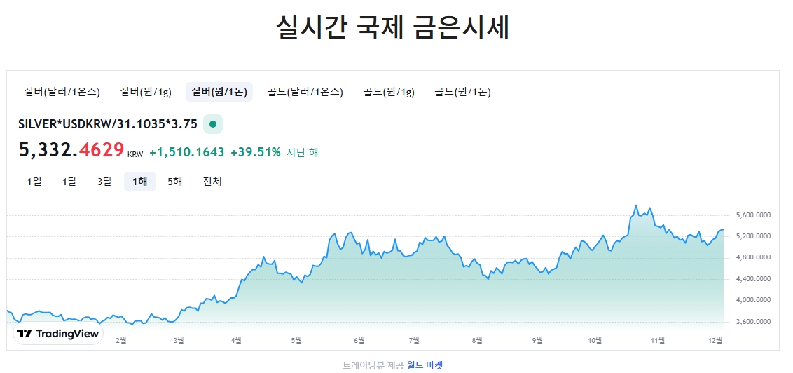 4. 한국 전통 단위인 ‘돈’ 기준으로도 시세 확인이 가능합니다. 실버(원/1돈) 기준으로는 현재 5,332.4629원이 표시되고 있고, 이 역시 작년보다 39.51% 오른 수치입니다. 기간별 확대·축소 기능도 가능해서 더 세부적으로 확인할 수 있어요.