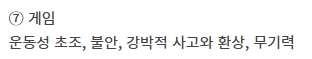 10. 일곱 번째로는 게임을 끊었을 때 생기는 반응입니다. 몸이 불편하거나 생각이 꼬이고 무기력함이 심해지는 경우가 많아요. 게임에서 얻던 만족감이 사라지면서 생기는 반응이기 때문에, 다른 취미나 상담을 통해 균형을 잡는 것이 중요합니다.