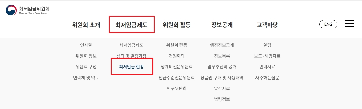📊 2. 메뉴에서 ‘최저임금제도 → 최저임금현황’을 클릭!