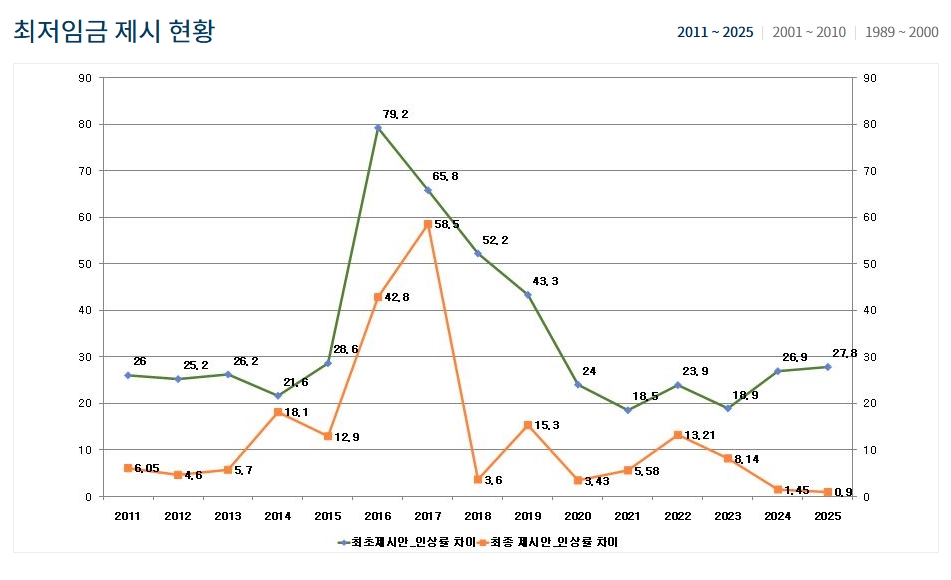 2025년 인상률은 최근 3년 중 가장 낮은 수치입니다. 2024년은 2.5%, 2023년은 5.0%였거든요. 물가와 고용 안정성을 함께 고려해 조정된 만큼, 다양한 이해관계를 절충한 결정이에요.