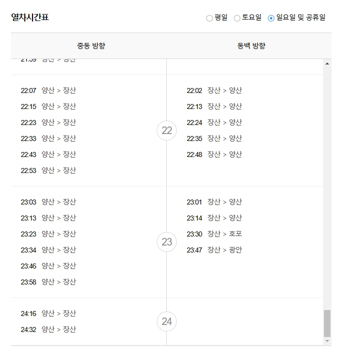 양산에서 장산으로 가는 막차는 각각 24:16, 24:32에 출발합니다. 하지만 이는 평일 기준이며, 주말이나 공휴일에는 시간이 달라질 수 있습니다. 따라서 ‘요일 설정’을 정확히 해주셔야 합니다.