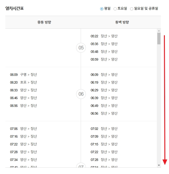 시간표는 한 페이지에 모두 보이지 않기 때문에 스크롤을 내려야 전체 내용을 볼 수 있습니다. 동백 방향, 장산 방향 등 원하는 방향을 설정하고 확인하면 정확한 막차 시간을 알 수 있습니다.