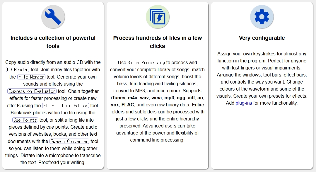 MP3, WAV, FLAC 등 다양한 포맷을 일괄 변환할 수 있으며, 효과 프리셋 저장 및 단축키 지정을 통해 편집 효율도 극대화할 수 있습니다.