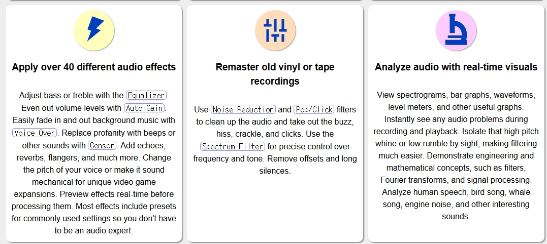실시간 스펙트럼 보기, 주파수 조정 등의 기능으로 정밀한 편집이 가능합니다. 노이즈 제거와 팝/클릭 필터를 통해 낡은 음원도 깨끗하게 복원할 수 있습니다.