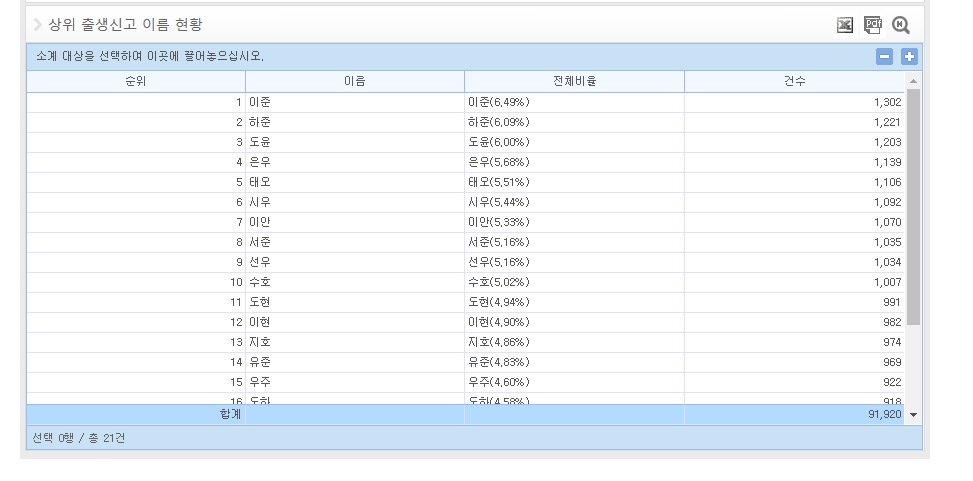 상단 메뉴에서 ‘통계’ → ‘출생’ 항목으로 이동한 뒤, ‘상위 출생신고 이름 현황’을 클릭하면 최근 출생신고된 이름들의 순위와 비율을 확인할 수 있습니다.