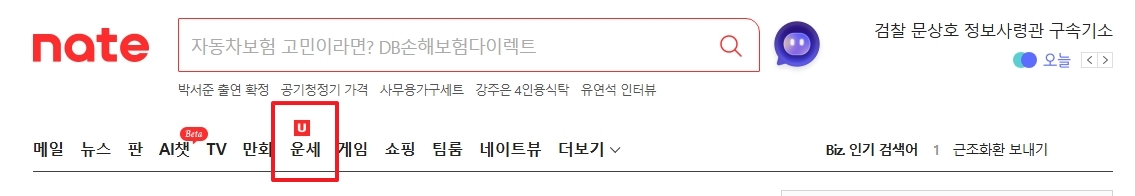 네이트 공식 홈페이지에 접속하면 메인 화면에서 다양한 운세 관련 기능을 확인할 수 있습니다. 꿈해몽 서비스도 이 메뉴 중 하나로 제공되고 있어요.