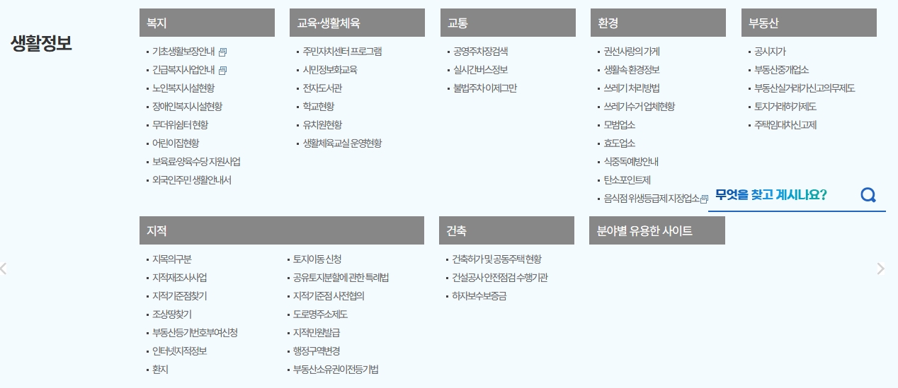 교통, 환경, 복지, 체육 등 실생활에 꼭 필요한 정보가 카테고리별로 정리되어 있어 찾기 쉽고 활용도가 높습니다.