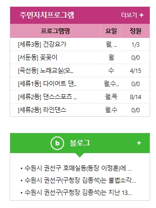 세류동, 서둔동, 권선동 등 동별 주민센터 소식과 행사를 편하게 확인할 수 있는 구조입니다.