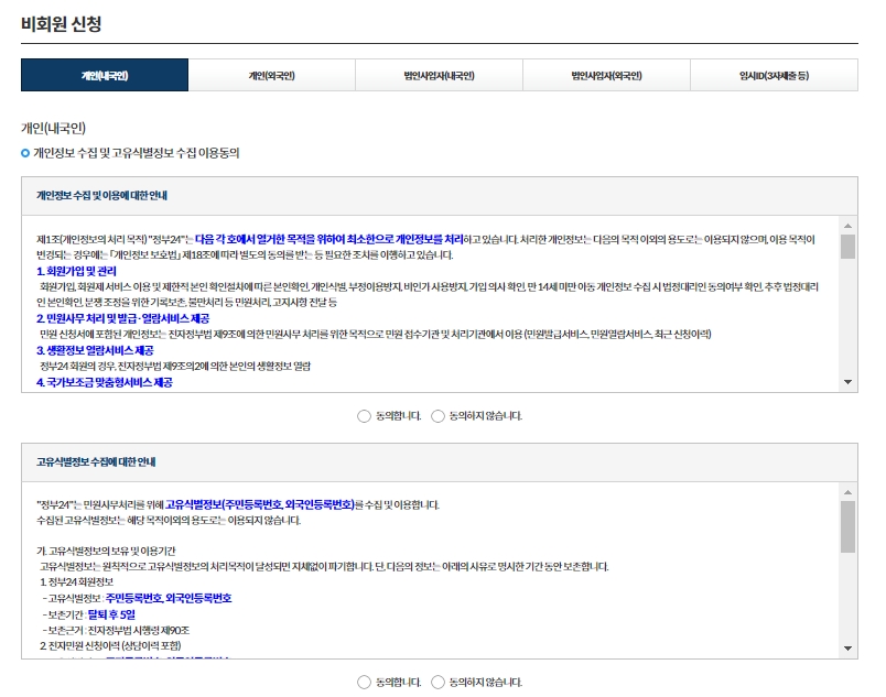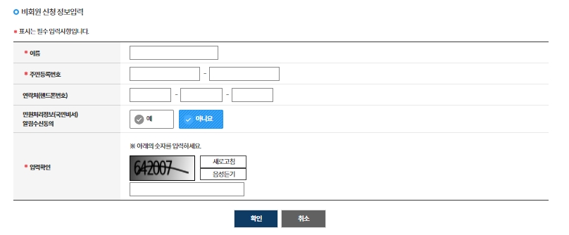 회원가입 없이도 신청이 가능하며, ‘비회원 신청하기’ 버튼을 누르면 약관 동의 후 개인정보 입력만으로 신청할 수 있습니다.