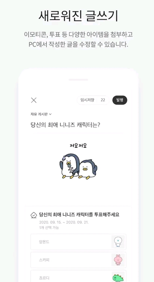 이모티콘, 투표 기능 등 다양한 입력 도구가 추가되어, 카페 커뮤니케이션의 질이 한층 향상되었습니다. 보다 재미있고 자유로운 표현이 가능해졌습니다.