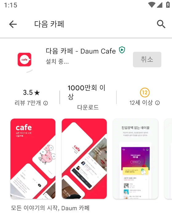 상단 검색창을 눌러 ‘다음 카페’라고 입력하면, 관련된 공식 앱이 검색 결과에 바로 나옵니다. 아이콘과 이름을 잘 확인한 후 설치 진행하세요.