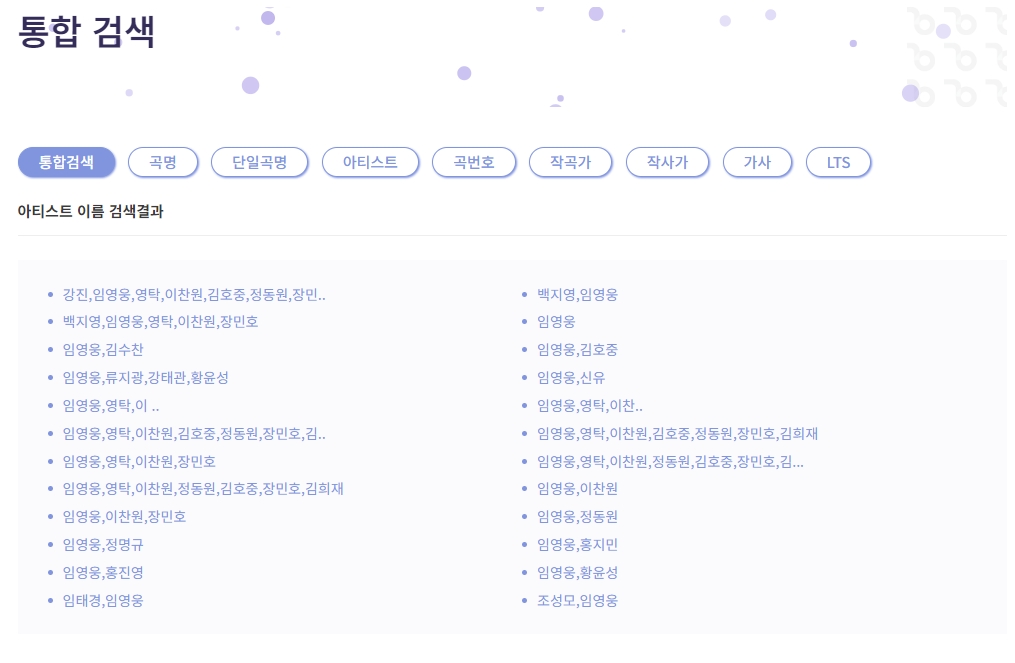 가수 이름으로 검색하면 해당 가수가 부른 곡 목록이 모두 표시되며, 여러 명이 함께 부른 곡도 별도로 정리되어 나타납니다.