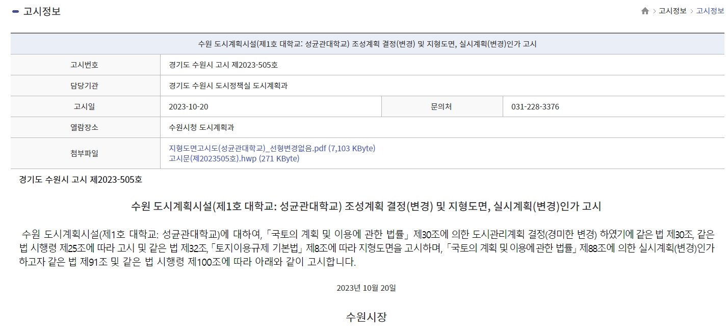 각 고시 항목을 클릭하면 관련 문서 및 세부 내용까지 확인 가능합니다. 계획 변경사항도 표기되어 있어, 실제 개발이나 이용 시 필수 확인해야 할 자료입니다.