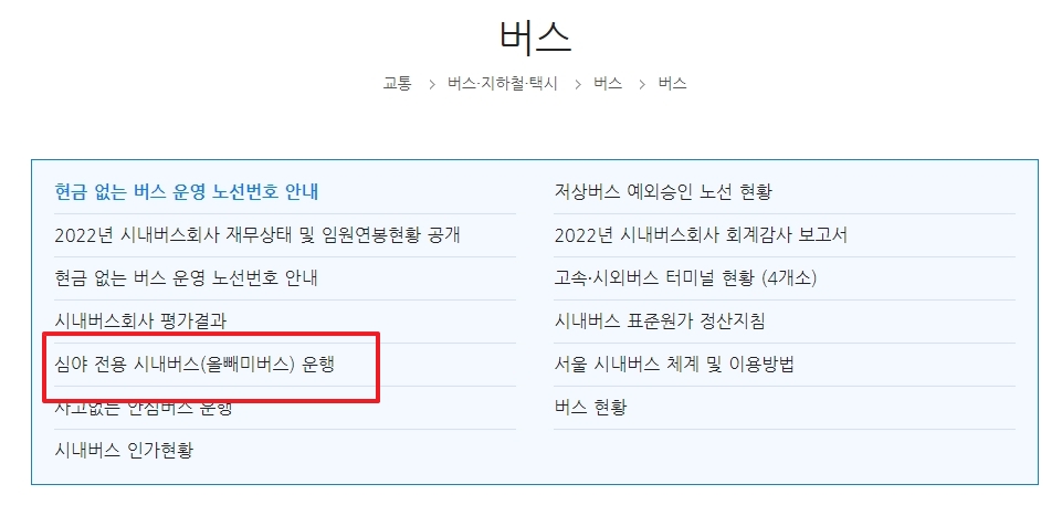 교통 메뉴에서 ‘심야 전용 시내버스’ 또는 ‘올빼미버스’ 항목을 선택하면, 서울시에서 운영 중인 심야 버스 노선별 운행 시간, 경로, 정류장 정보 등을 구체적으로 확인할 수 있습니다.
