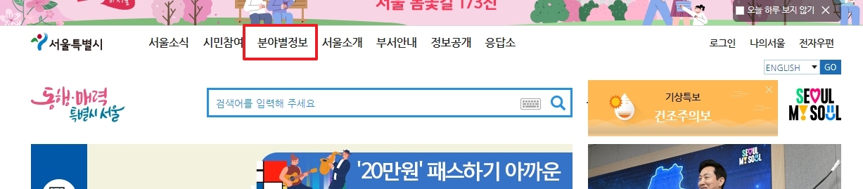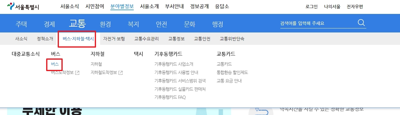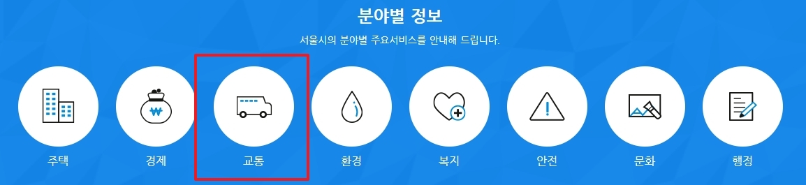 홈페이지 메뉴 중 ‘분야별 정보’에 들어가 ‘교통’ 항목을 선택하면, 버스, 지하철, 택시 등 서울시가 제공하는 다양한 교통 수단 정보에 접근할 수 있습니다.