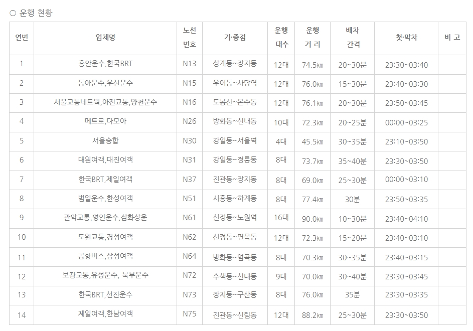 서울 심야 버스는 총 14개 노선으로 구성되어 있으며, 밤 11시 10분부터 새벽 6시까지 운행됩니다. 각 노선은 ‘N’으로 시작하는 고유 번호를 가지며, 주요 지역을 연결해 늦은 귀가나 야간 이동에 실질적인 도움을 줍니다. 운행 대수와 배차 간격도 적절히 조정되어 있어, 심야 시간에도 효율적인 이동이 가능합니다.