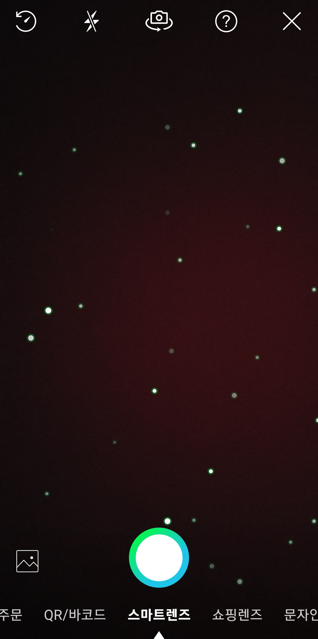 메인 화면이 로드되면 맨 아래 초록색 ‘+’ 버튼을 눌러 숨겨진 메뉴를 펼칩니다. 여기서 렌즈를 비롯한 추가 기능으로 접근할 수 있습니다.