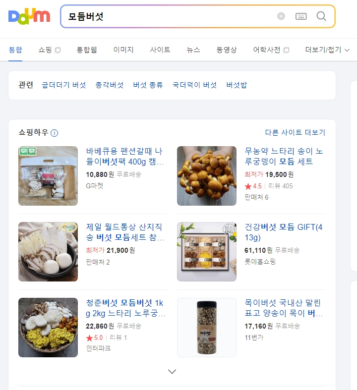 인터넷 쇼핑몰에 모듬버섯이라고 검색하면, 대부분 팽이버섯, 느타리버섯, 새송이버섯, 노루궁뎅이버섯 등이 포함된 세트가 판매되고 있습니다. 이처럼 포장된 제품을 통해 식용 버섯만을 손쉽게 구입할 수 있어 초보자에게도 추천할 만합니다.