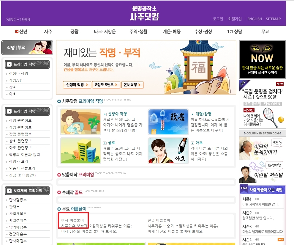 1. 사주닷컴 홈페이지에 접속한 뒤 상단 메뉴에서 무료 이름풀이 항목을 선택합니다. 단 메뉴 명칭이 사이트 업데이트에 따라 달라질 수 있으니 비슷한 용어가 보인다면 메뉴 구조를 확인하세요.