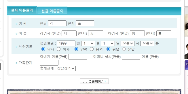 3. 한자 이름풀이 입력 화면에 생년월일과 성, 이름, 성별, 양력 항목을 빠짐없이 입력해야 정확한 결과를 받을 수 있습니다. 입력 칸 오작동 시에는 페이지를 새로고침하거나 브라우저 하단으로 스크롤하여 숨겨진 입력 창을 확인하세요.