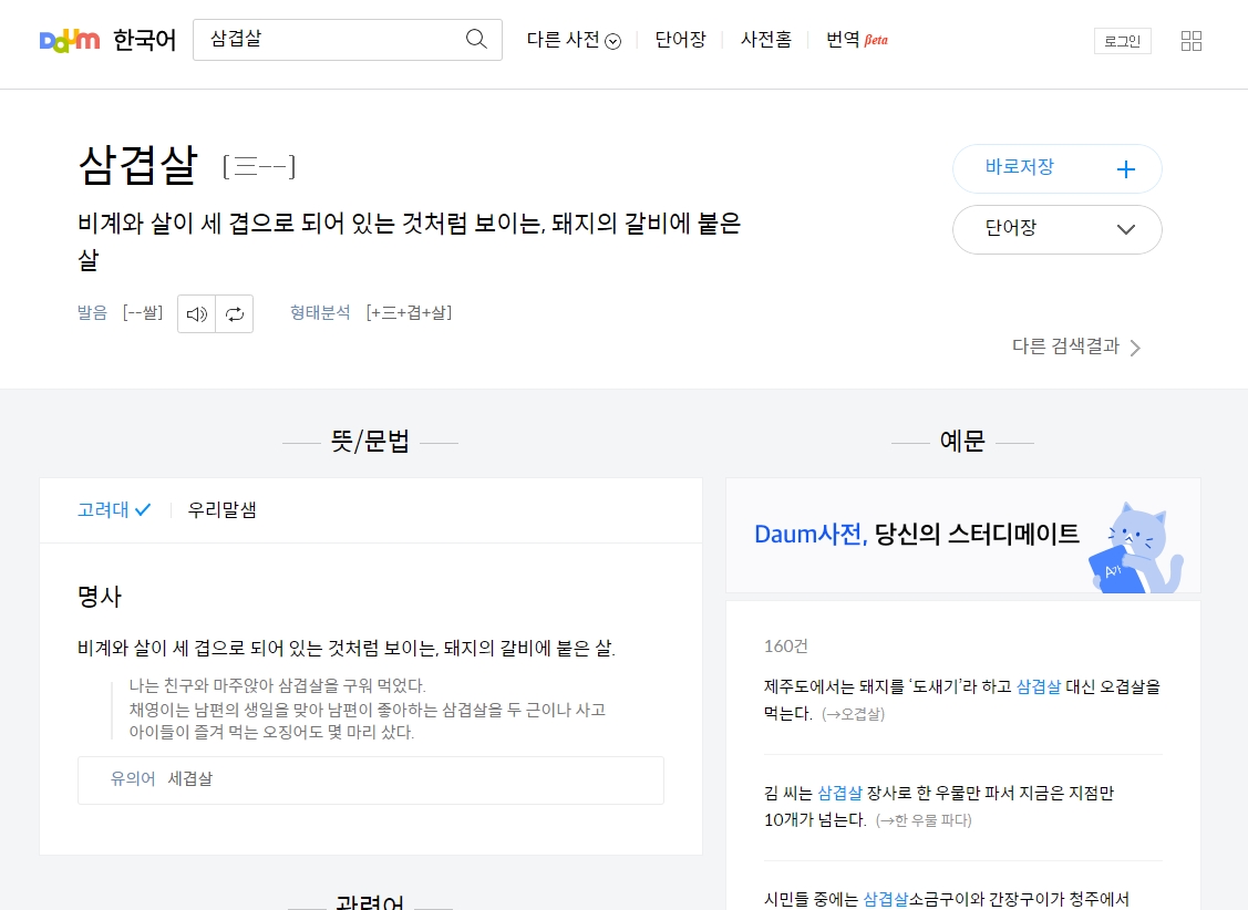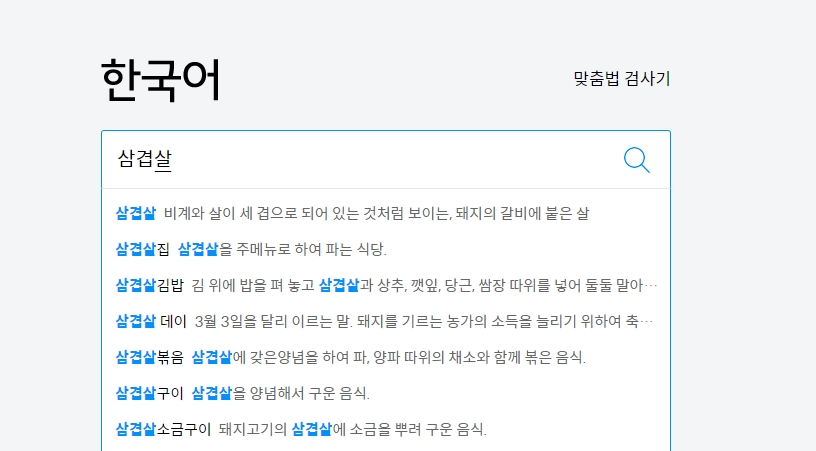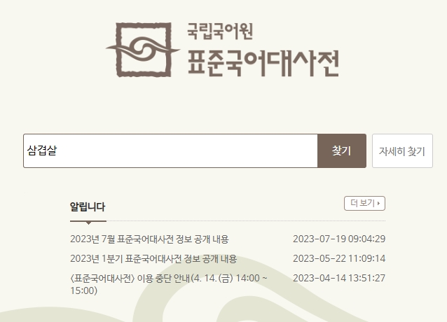1. 다음 국어사전 홈페이지는 누구나 쉽게 접근할 수 있는 직관적인 인터페이스를 제공해 빠른 단어 검색을 지원합니다. 검색창이 명확하게 배치되어 있어 '삼겹살'을 입력하면 곧바로 뜻과 예문을 확인할 수 있습니다.