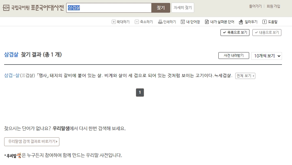 4. 동일 단어 '삼겹살' 검색 결과는 깔끔하게 정리되어 용례와 함께 주요 정보가 제공됩니다. 다만 추가 예문을 확인하려면 별도 탭으로 이동해야 할 수 있습니다.