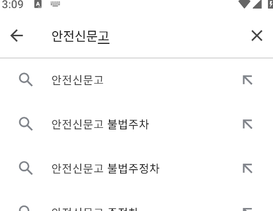 2. 상단의 검색창을 누르면 키보드가 활성화되어 검색할 준비가 됩니다. 다음 화면에서 안전신문고라고 입력하면 자동 완성 기능이 유사업체 이름과 구분해 정확한 앱만 노출됩니다.