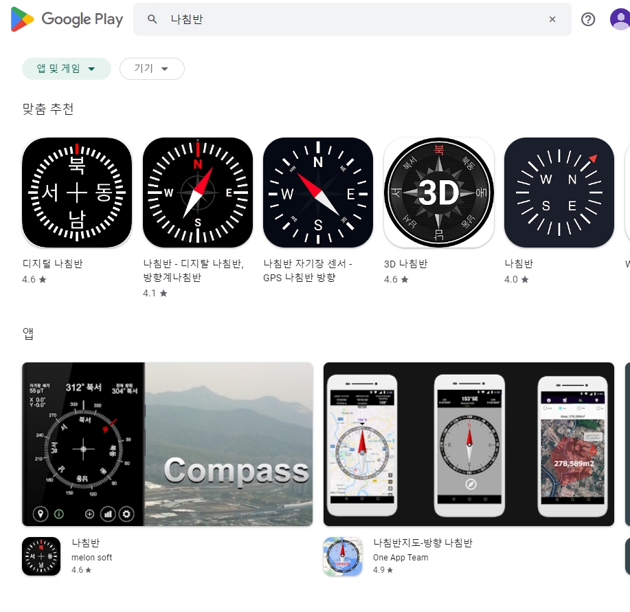 3. '나침반'으로 검색하면 다양한 앱 목록이 표시되고, 각 앱의 평점과 리뷰를 통해 신뢰도를 미리 판단할 수 있습니다. 다만 일부 앱은 광고가 과도하게 표시될 수 있으니 평점 하단의 리뷰 내용을 꼼꼼히 살펴보는 것을 권장합니다.