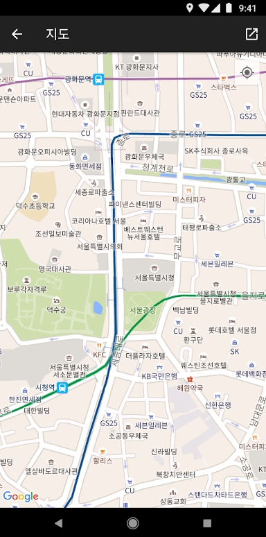 9. 별도의 지도 앱 대신 내장된 나침반 아이콘을 활용할 수도 있습니다. 지도 화면에서 우측 상단의 아이콘을 탭하면 방향이 표시되어 본인의 시선 방향에 맞게 지도를 회전시킬 수 있습니다.