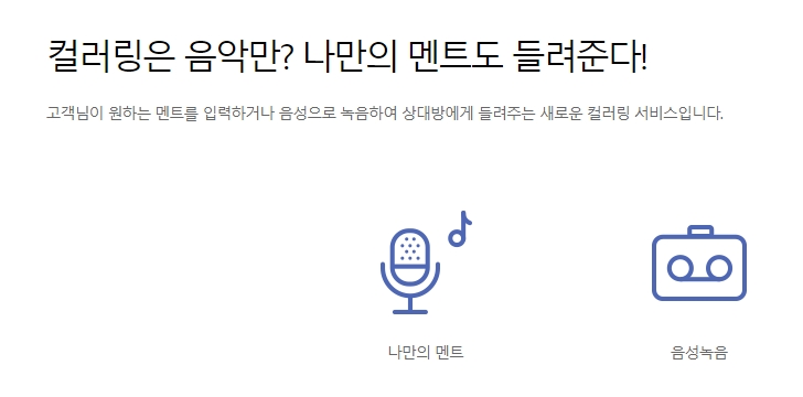 컬러링 말고도 멘트 녹음 기능이 있습니다. 자신의 음성으로 녹음하거나 텍스트 멘트를 입력해서 설정할 수 있는 서비스인데요. 상황에 맞게 활용하면 훨씬 개성 있는 인상을 남길 수 있습니다.