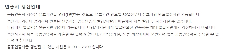 5. 갱신은 만료일 30일 전부터 가능하며, 갱신 가능한 시간은 오전 1시부터 밤 11시까지입니다. 인증서가 PC나 USB 등 저장매체에 있어야 하며, 타 기관이나 타 은행에서 발급받은 인증서는 해당 기관에서만 갱신이 가능합니다.