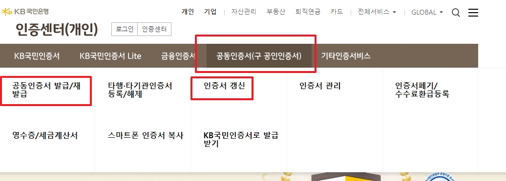 2. 홈페이지 안에서 인증센터 또는 공동인증서 관리 메뉴를 찾습니다. 해당 메뉴로 들어가면 개인 인증서 관련 다양한 기능들이 나오며, 여기서 갱신 기능을 선택할 수 있습니다.