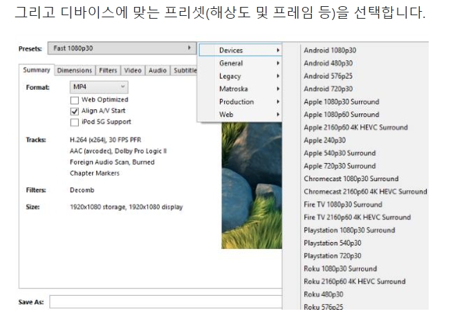 파일을 선택하고 나면 해상도, 프레임 수, 저장 위치 등 여러가지 설정을 조정할 수 있는 화면이 나타납니다. 이곳에서 자신의 기기에 맞게 옵션을 바꾸는 것이 중요합니다. 스마트폰에 맞게, 혹은 태블릿이나 TV용으로도 최적화된 설정을 고를 수 있어서 활용도가 매우 높습니다.