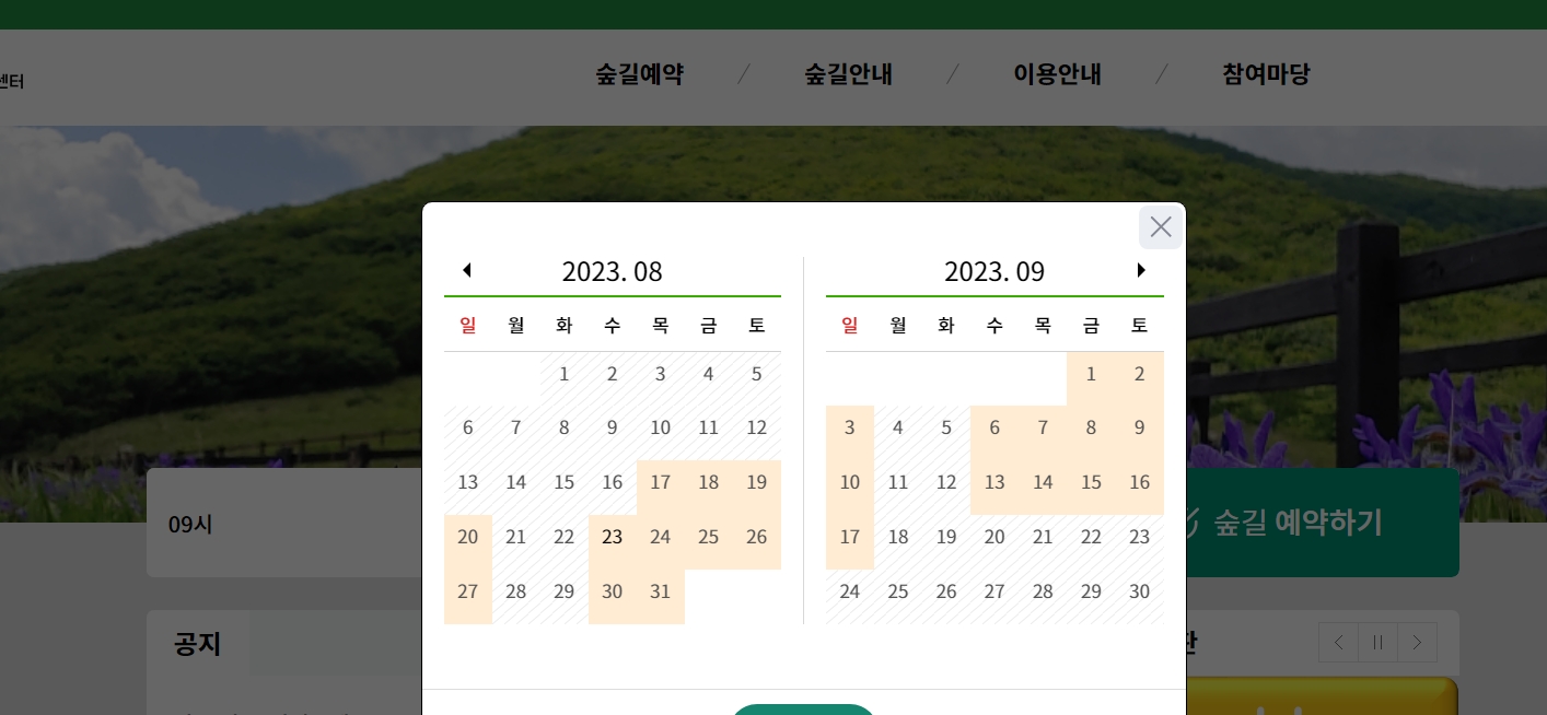 이제 커다란 달력이 화면에 나타나게 되는데요, 여기서 우리가 실제로 곰배령을 방문할 소중한 날짜를 직접 고르는 거랍니다. 달력을 보면 예약이 가능한 날짜들은 눈에 잘 띄게 주황색으로 표시되어 있어서 아주 쉽게 알아볼 수 있어요.