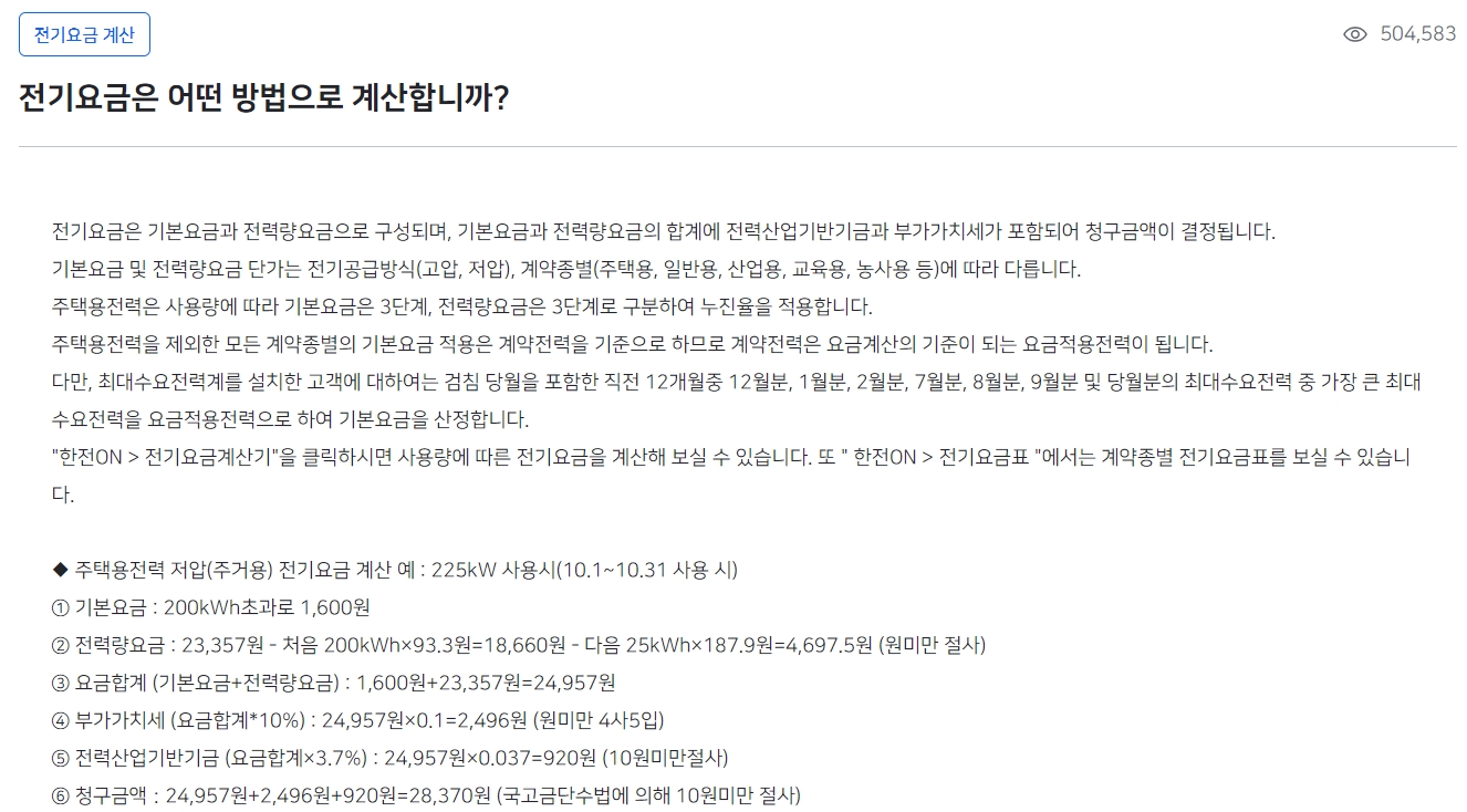 전기요금에 대한 아주 기본적인 것부터 시작해서 좀 특별한 경우에 어떻게 해야 하는지에 대한 설명까지, 정말 많은 정보가 있어서 필요한 내용을 엄청 빨리 찾을 수 있는 장점이 있습니다. 이 메뉴 하나만 잘 살펴봐도 웬만한 궁금증은 해결될 정도입니다.