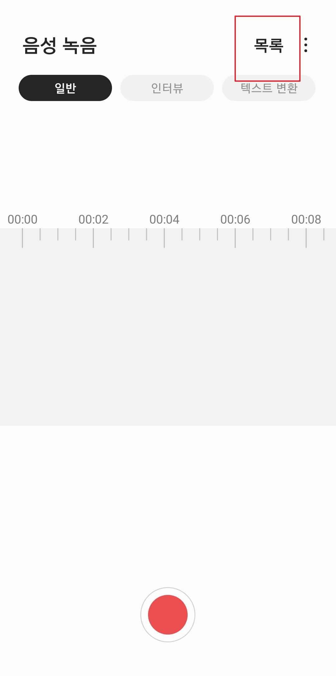음성 녹음 앱을 켰다면, 아마 커다란 녹음 버튼이 먼저 보일 수 있어요. 하지만 우리는 파일을 찾으러 온 거니까, 화면 오른쪽 위에 있는 점 세 개나 줄 세 개 모양으로 생긴 아이콘을 찾아 눌러주어야 합니다. 이걸 누르면 '목록'으로 들어갈 수 있는데, 여기가 바로 그동안 녹음했던 파일들이 전부 모여있는 저장 위치라고 생각하면 딱 맞아요. 잊지말고 꼭 눌러주세요.