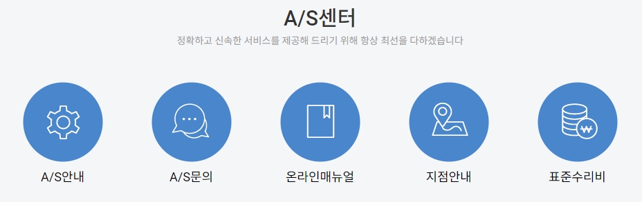 2. 홈페이지에 들어가 보면 위쪽에 여러 메뉴들이 보이는데, 그중에서 A/S 센터라는 메뉴가 정말 유용하게 쓰일 때가 많아요. 갑자기 기기가 고장 나거나 문제가 생기면 당황하기 마련인데, 이 메뉴를 통해서 A/S 접수나 문의를 아주 쉽게 할 수 있습니다. 심지어 수리 비용이 어느 정도 나올지 미리 확인해볼 수 있는 표준수리비 안내까지 있어서, 예상치 못한 지출에 대비할 수 있다는 점이 정말 마음에 들더라고요.